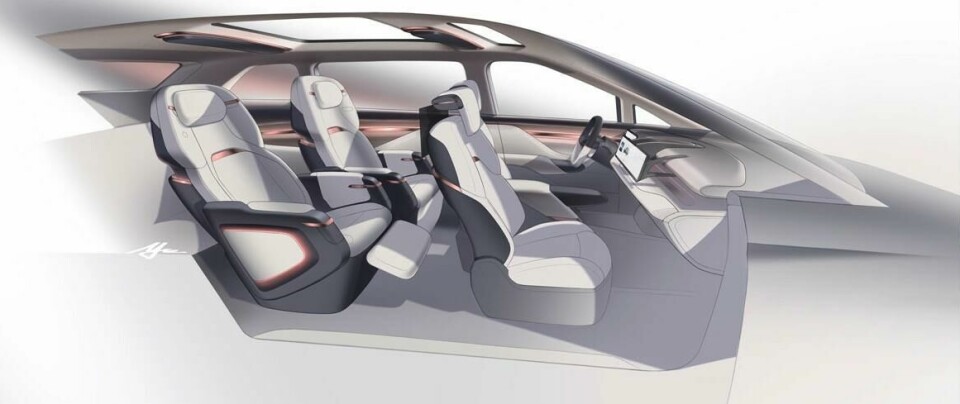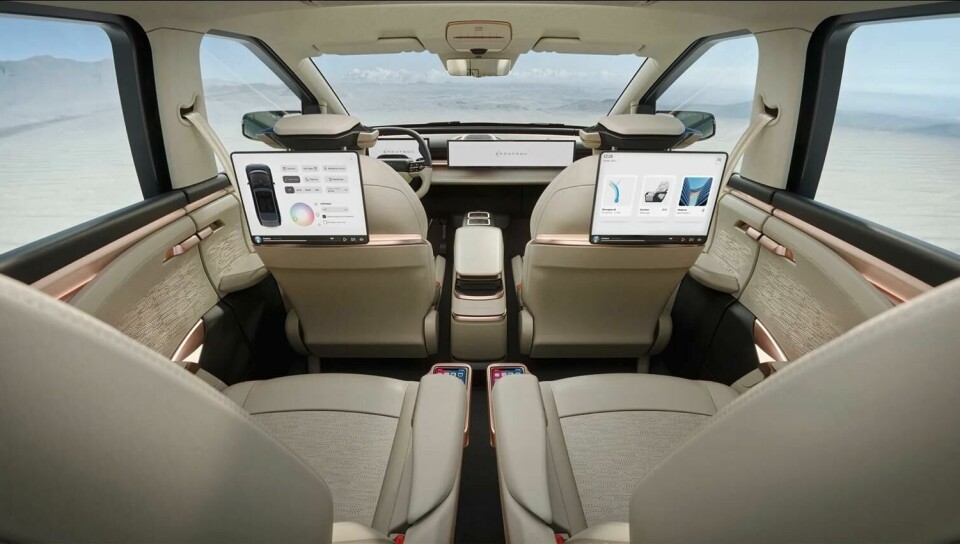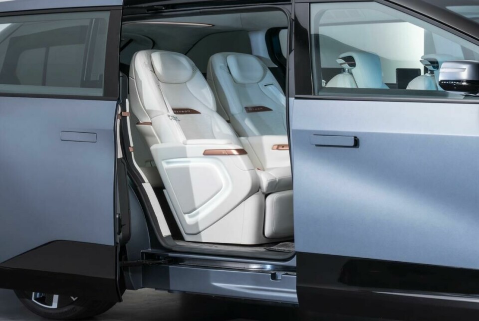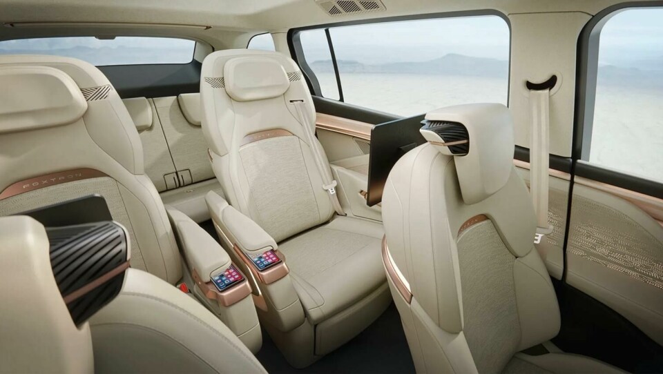 The Model D is a large vehicle with a length of approximately 5100 mm and a wheelbase of 3200mm (about the size of a Ford Transit van). It can seat seven in luxury, especially in the second row, where reclining captain’s chairs face iPad-like touchscreens, and there is a pocket on the armrests for that all-important iPhone. Presumably it charges as well.
