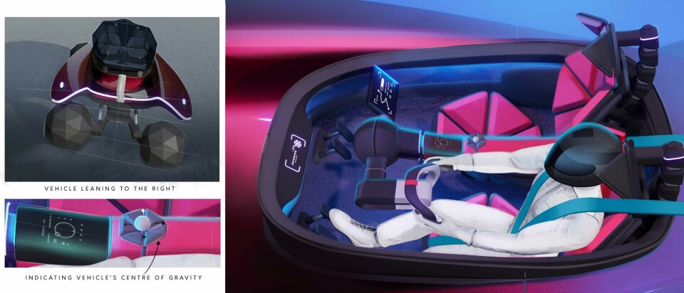 Elaborating, Honey explains that in order to give the driver the ”feeling of full control over the vehicle, they should control it with their full body in an ergonomic way. Having the driver prone allowed me to design a more exciting and aerodynamic exterior whilst designing a functional and minimalist interior that focuses on supporting and adapting to the drivers’ movements.”