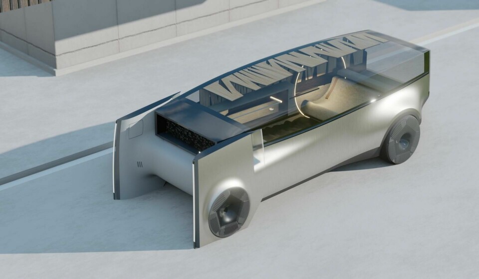 The exterior design is fairly restrained, taking the form of a shuttle bus. Tall strip lights at the front serve as headlights, while a huge glass greenhouse takes up all remaining space above the shoulder line.