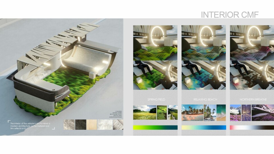 For example, the interior uses a sunblind pattern inspired by the light shining through a forest. In this way, the lighting is dappled and more enjoyable for the passenger – rather than sitting in blind daylight. The interior floor is modular, meaning it can transform from a plain flat surface to something that feels organic. Different interior CMF designs range from a spring field, relaxing beach and a winter-style setting that is described as ‘northern breathe.’