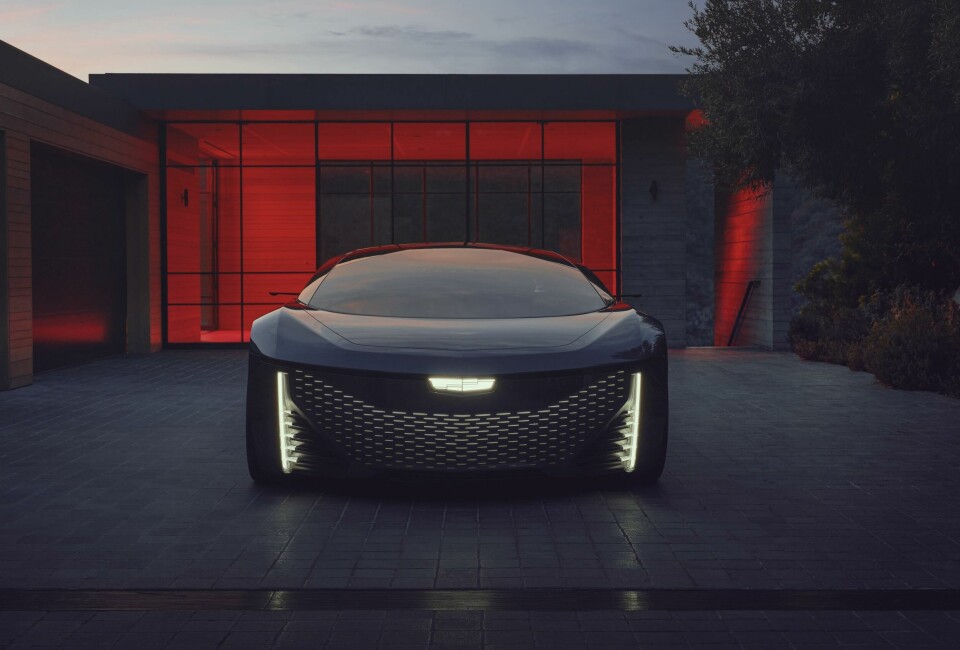 The face is dominated by a large glossy black mask with a simple lighting graphic consisting of many small, dashed lines, as well as two vertical LED strips to mark air intakes and the illuminated Cadillac logo at the centre. The curved rear is distinct due to the sloping roof meeting the lid, which sits at the same level as the belt lines to ensure cohesion.