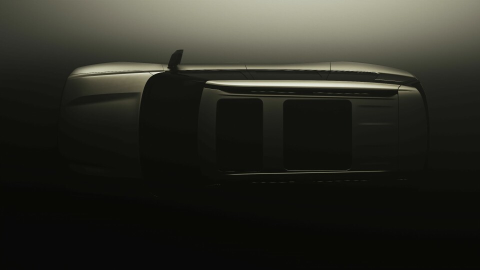The teaser hints at a square shouldered, upright silhouette framed by thin vertical LEDs. The Rocky Mountains are captured in the triangular creases in the fenders, and the broad hood keeps clean, straight lines.