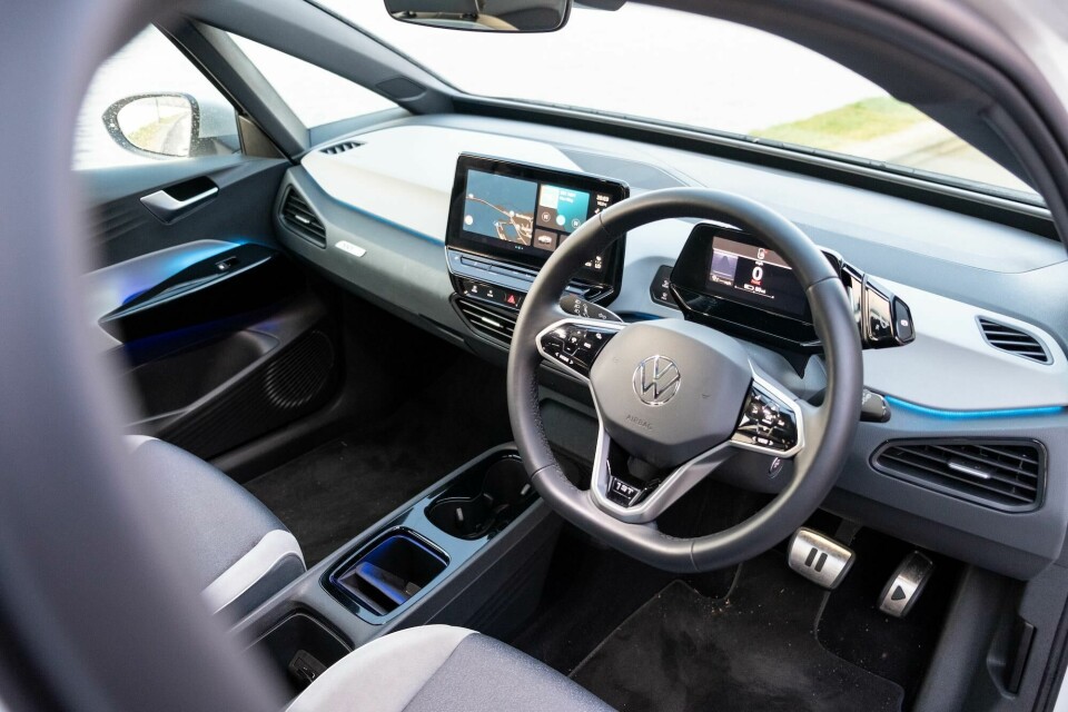Volkswagen’s interior design team clearly took a reductionist approach when creating the inside of the ID.3. There are barely any buttons apart from those on the steering wheel and a small cluster to change the mirrors. The climate controls under the 10-inch centre screen are touch-sensitive but provide no haptic feedback. They feel a little alien at first but soon become familiar. Everything else is accessed via the touchscreen, which floats on top of the dash, and is a little chunky in its glossy-black housing when compared to some of the slimmer touchscreens on the market today.