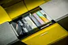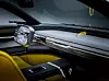 The tunnel itself is also innovative for concealing a capacitive horizontal screen that allows rear passengers to flick through what appears to be a hidden box of seven-inch single record sleeves to select music – the images are actually digital but of a similar size – while further up the car towards the driver, a section allows a mobile phone to connect with the car in an extremely pleasing way. Place the phone where the back-lit area indicates and a rubber-backed section of the tunnel’s smoked wood matt-finish veneer deforms to allow the phone to sink into a small depression and welcome the user to the car. When ready to leave again, lifting the phone off allows the tunnel’s shape to move gently back upwards to become a single smooth surface again. It’s a fantastic effect that needs to be watched on video – or seen in person – to fully appreciate.