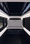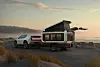 The rectangular shell is accessed through the top-hinged rear door. Inside is a basic rectangular room, with a futon-like couch that folds down to make a queen-sized bed. A kids bunk bed will be available to expand the sleeping area. The roof of the Base Station pops up to create 7 feet (2.1 meters) of head room. Five modular windows allow a lot of light inside, and the LED light that rings them lights up a campsite.