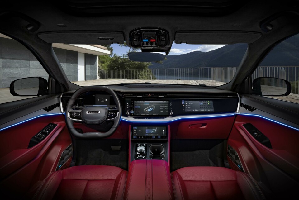 Then there are the screens, all 45 inches of them, but the designers have taken a different approach to some rivals. “This is a Jeep, so it’s not our methodology to just put a floating tablet in the middle of the vehicle,” says Galante. “We want to make sure that if you want the technology off, that it goes away. If you tap the technology on, it’s presented and so all 45 inches of screens are hidden behind glass.”