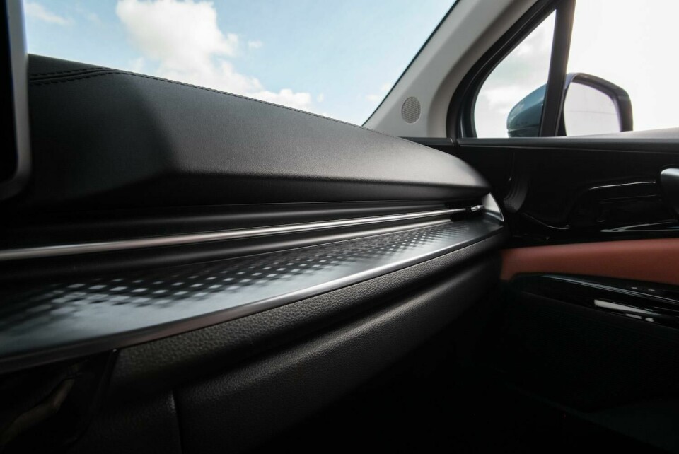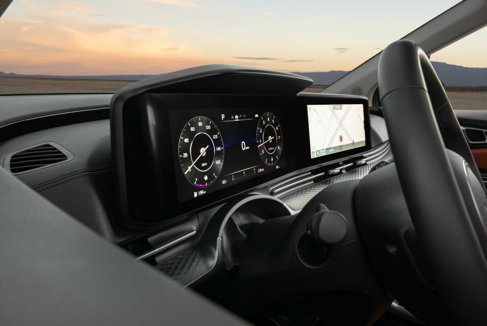 The dash is split into three main sections, the upper finished in leather with detailed stitching, a middle silver layer textured with small indentations and air vents tucked away, and a lower made of hard plastic. There is also a small ledge at the base of the windshield that joins the doors and each end, cocooning the front passengers. A large unit mounted to the upper dash area houses both the 8-inch touchscreen and the driver instrument cluster.