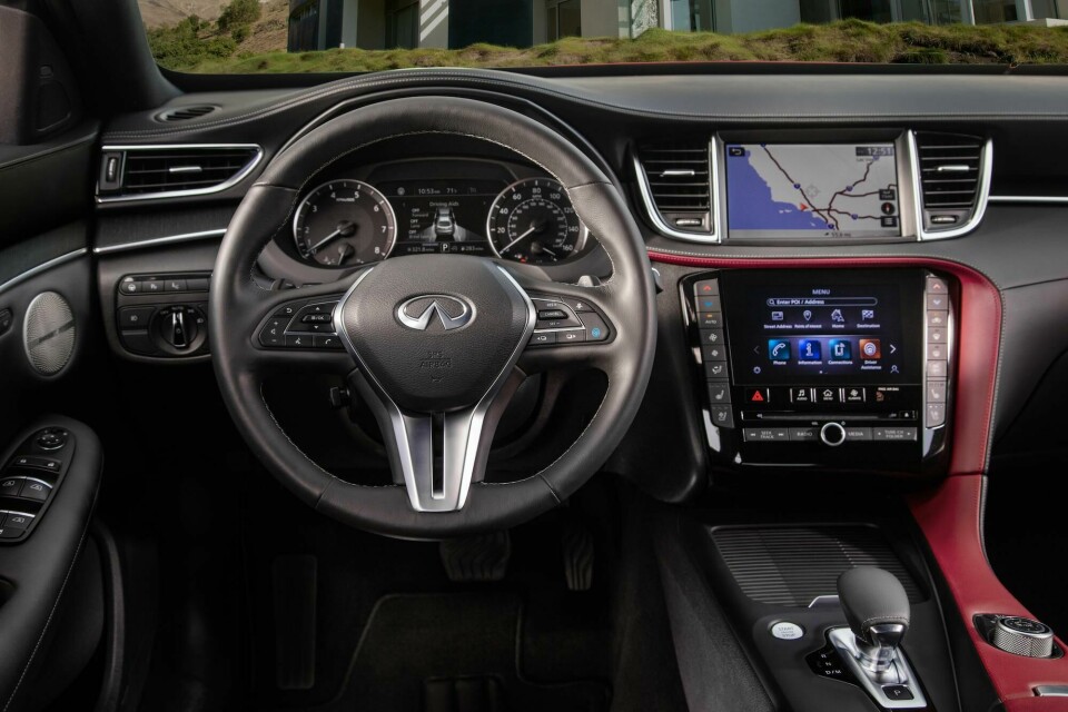 Infiniti has always strived for luxury on the inside of its vehicles, and the QX55 is no different. The interior is adorned with high-end materials, most of which is semi-aniline leather that shows off its natural quality. Chrome is used to break things up, accenting certain areas. There is a chrome line starting on the doors and running the width of the dash, interrupted only by the steering wheel and the small upper screen with adjoining air vents.