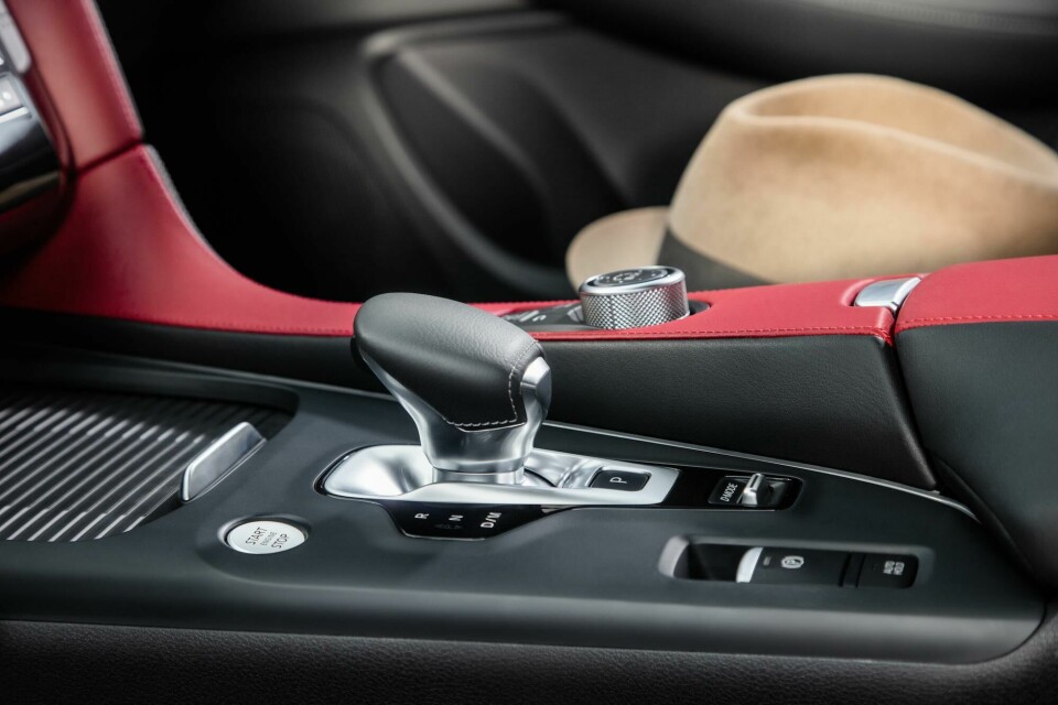 The two-tone centre console has an unusual shape. It is dissected in half with a long diagonal line. The black leather part includes the gear stick, parking brake, start button and some storage, while a drive mode dial sits on the red leather section before it narrows and rises to meet the dash, wrapping around one side of the main lower touchscreen. It seems to section the screen and driving area off from the front passenger, putting an emphasis on the driver’s seat and position.