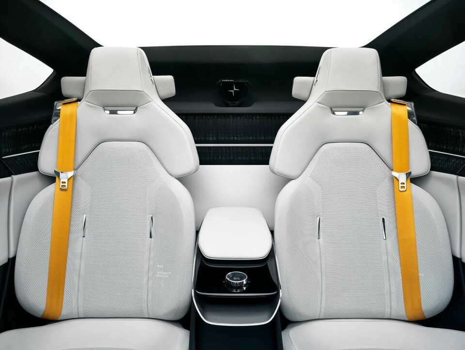 Vegan principles seen on the Polestar 2 are taken to another level with the Precept. Seat covers are 3D knitted from recycled PET bottles in a single thread (made to size with no off-cuts). Recycled plastic bottles are also used for the headliner textile and seat bolsters, while headrests make use of a cork-based textile incorporating recycled cork from the wine industry. The lower part of the interior is dark, and the upper areas and uppers of the seats are light, an interesting reversal of how some other EV concepts have chosen to deliniate interior spaces. In the Precept, it makes the seating appear light and weightless.