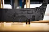 These landscapes were created using 3D multi-directional marquetry, laser etching, 3D ink layering and gold-leafing paired with embroidered leather sections which continue the golden roads. Instead of metal speaker covers, these were integrated into the wooden door panels. Similar techniques were used on the picnic tables which feature a Phantom I and Phantom VIII.
