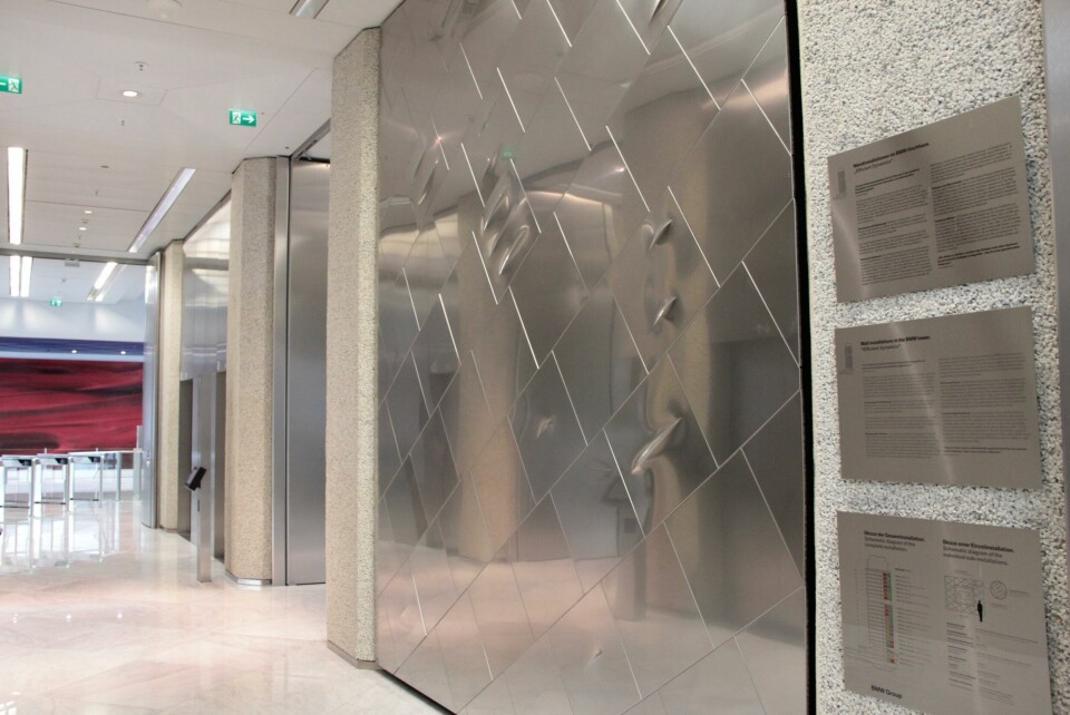 “Panke said, ‘I want anyone to know where they are in the building because it makes each floor unique in some way, I want it to reflect the latest in technology we have to offer, and I want it to reflect our workforce and the way we make our cars,’” Bangle remembers. His resulting creation was a combination of custom-made metal pieces, car parts, and coloration that varied between floors. “I came up with a set of GBK – ginableschkleid – this was how we formed the hoods on the M Z4. It uses a robot to actually shape the metal, not stamp. I had the robot shape individual pieces of stainless steel, so there’s hundreds of them going up into a shape diagram that’s different on every floor.”