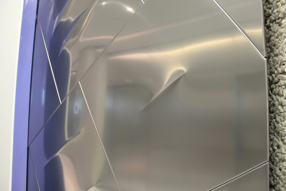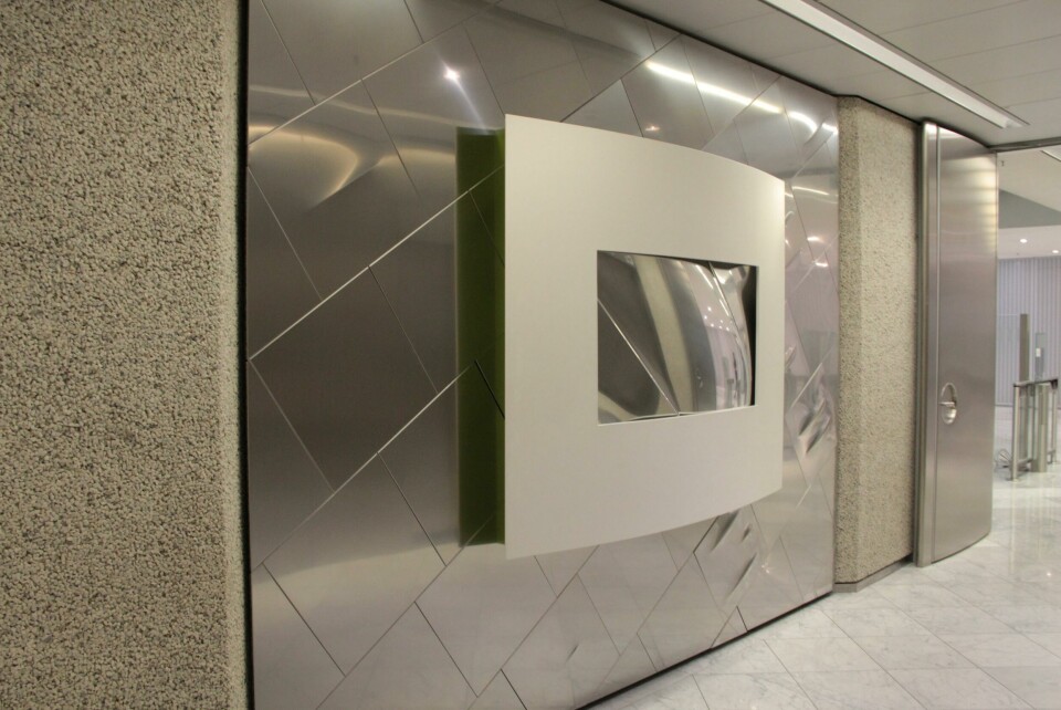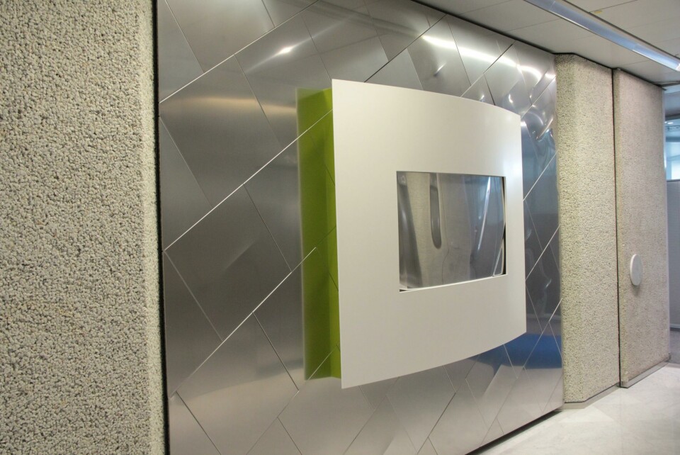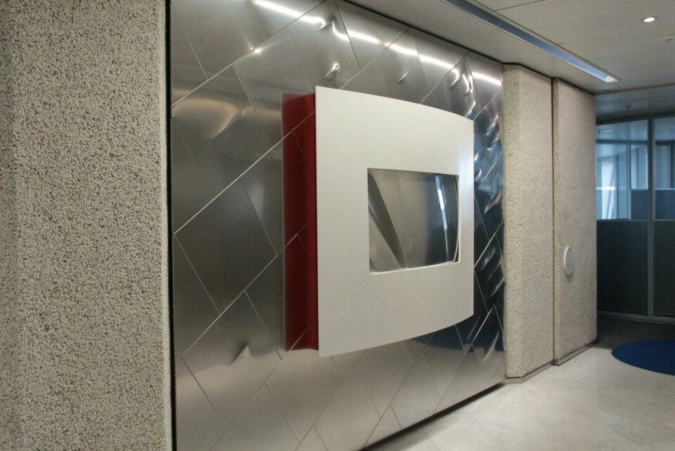 Bangle also took Panke’s advice about “reflecting” literally. “I took the aluminium hoods from our cars, had them polished up to a mirror, and put them inside of a frame, so you see a mirror of yourself,” Bangle explains. “From the side, you can see a color spectrum that runs from red to green one way and green to red the other way, but different reds and greens. So depending on what the hood is and what color you see, you know what floor you’re on. Each one is different but made with the same pieces. And you reflect the workforce and the worker in it. I was actually quite proud of it.”