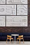 The employee lobby showcases parts from a disassembled Bronco Raptor sourced from the Michigan Assembly Plant, displayed in front of a specially designed brick wall that matches the building’s exterior.