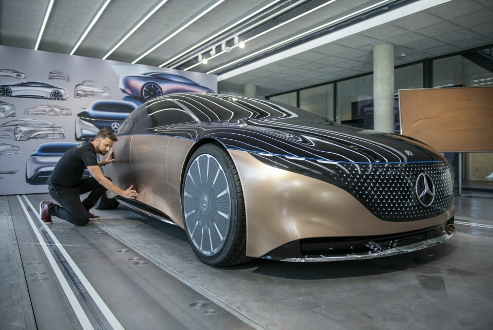 By comparison, the new studio officially unveiled to the world’s press in September is a totally different experience. Resembling a giant metal, glass and concrete Smarties tube (50 metres long, 20 metres wide and covering 3000 sq metres in total), up to 49 designers will be able to work there, across all car design disciplines from exterior, interior, colour and trim, UX and digital. About 34 such designers were in place when we visited, already utilising facilities that include a 42-metre long plate, power walls and more. The studio is run by ex-Citroën design director Alexandre Malval and will be a resource for Mercedes designers worldwide to visit and work at, plus host brand-related events as well.