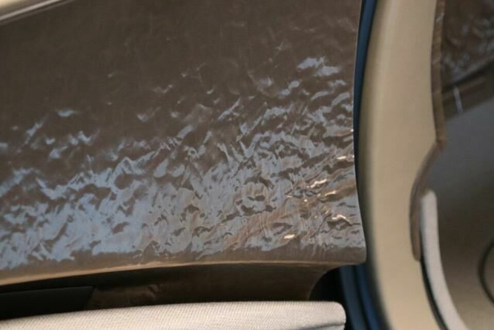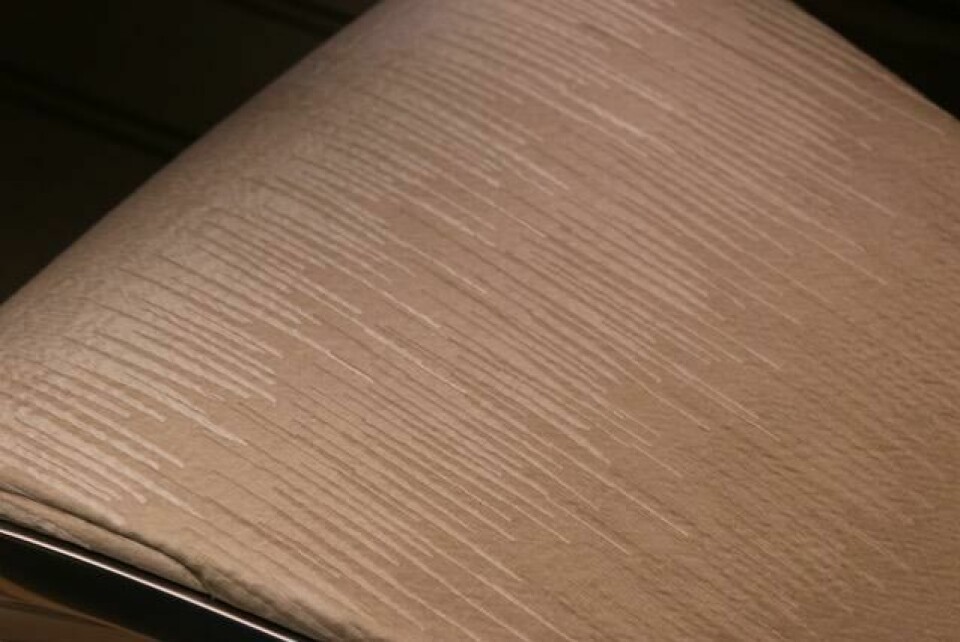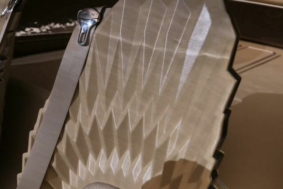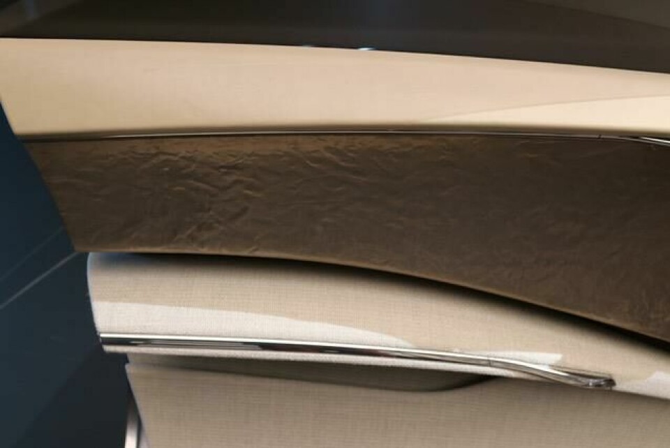The door cards condense the ripple – with an effect that’s reminiscent of gold leaf paper, in distressed state – a treatment that continues on the firewall and which provides a soft contrast to the sharp, domino-topple of 21 OLED screens that form the IP display. Working in unison, these flow in a wave, from upright to flat – providing a vivid, high-tech sharpness set amongst the soft golds, creams and warm, pinky-browns that adorn the rest of the interior.
