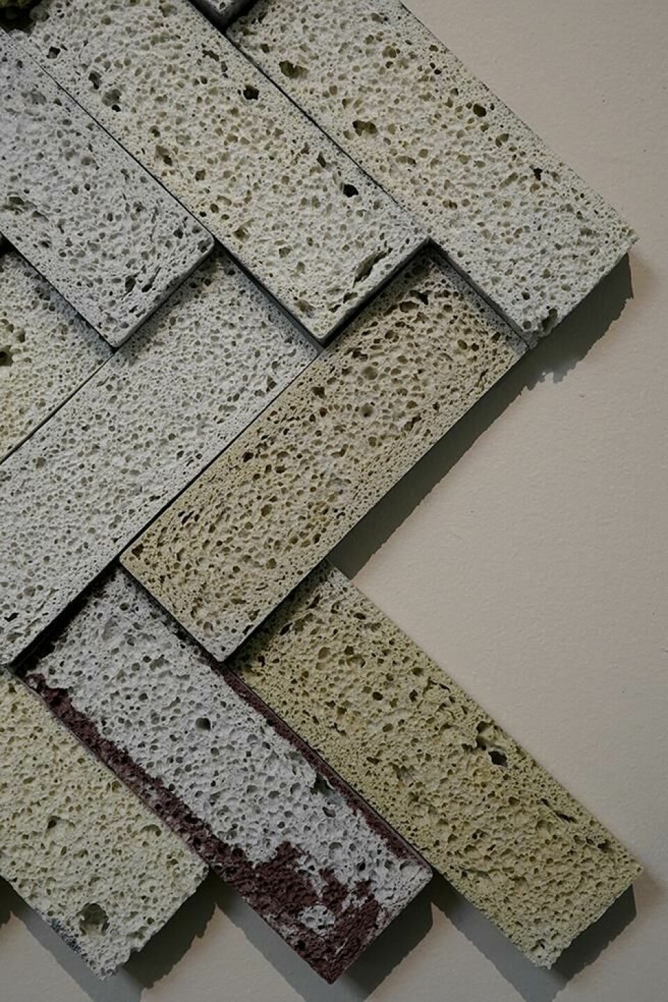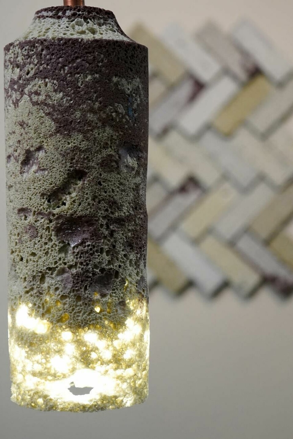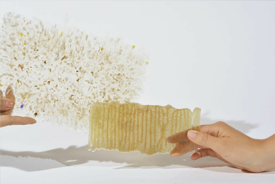 Foamation: French-American designer Steven Akoun’s glass foam is created with sustainable materials such as recycled glass and uses eggshells as a mineral foaming agent. The result is a stunning lightweight structure which, as wall tiles, has sound-absorbing characteristics.
