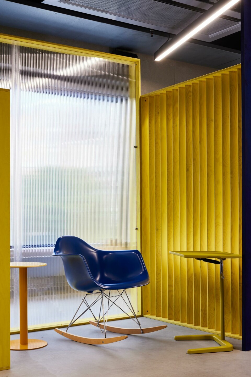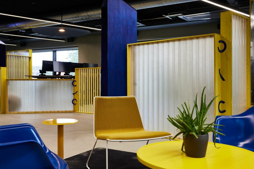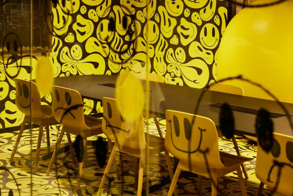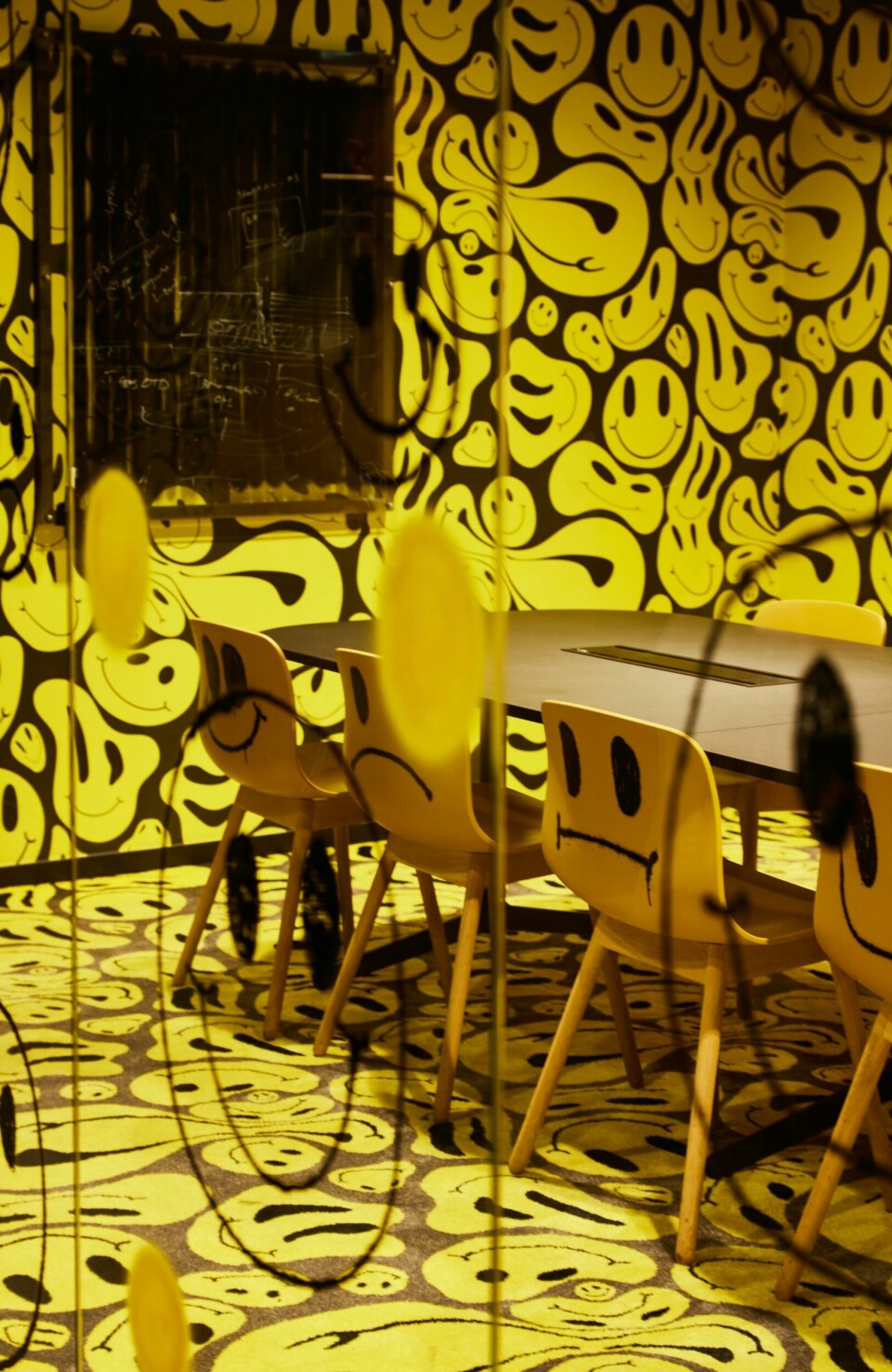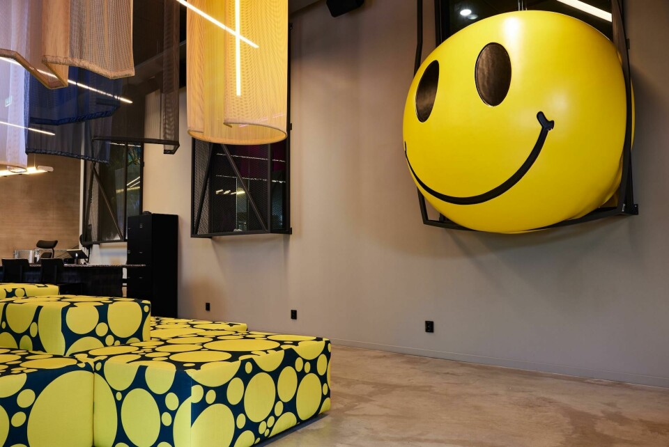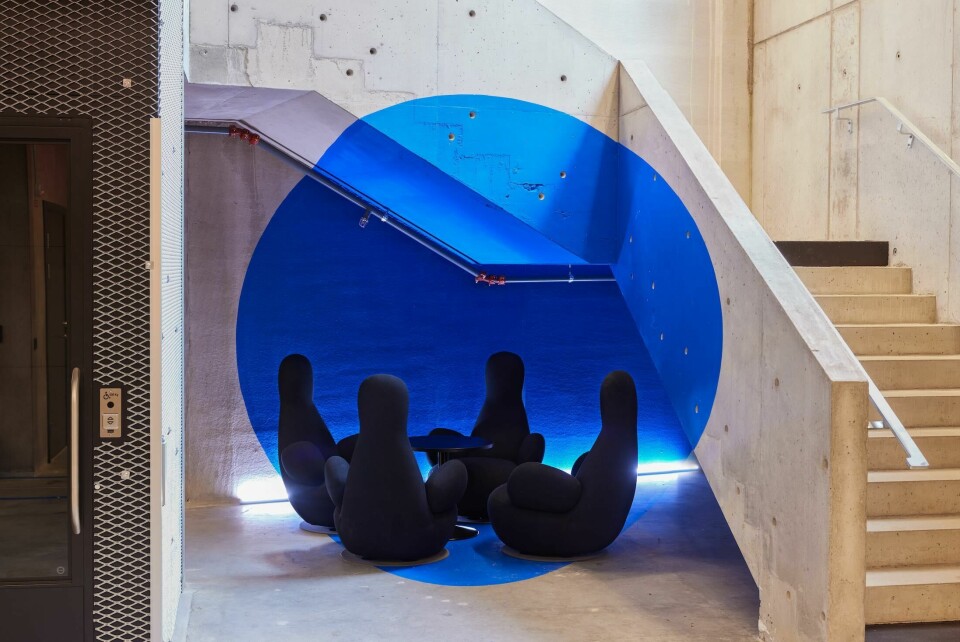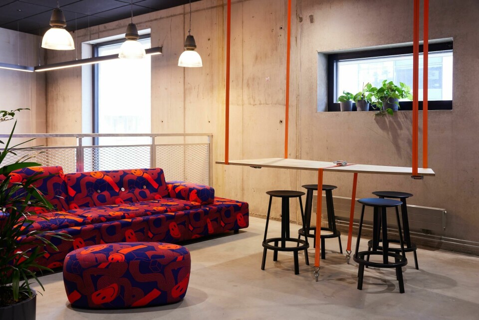 The interior design is nothing if not exuberant, channeling a Silicon Valley aesthetic a long way removed from Scandi minimalism. So, we have giant smiley faces, dotted sofas and red meeting room tables. Much of the furniture has been sourced second-hand to keep with a sustainable ethos and give the space a lived-in feel. Similarly, the architects encouraged the tradesmen to leave their measurements on the walls.