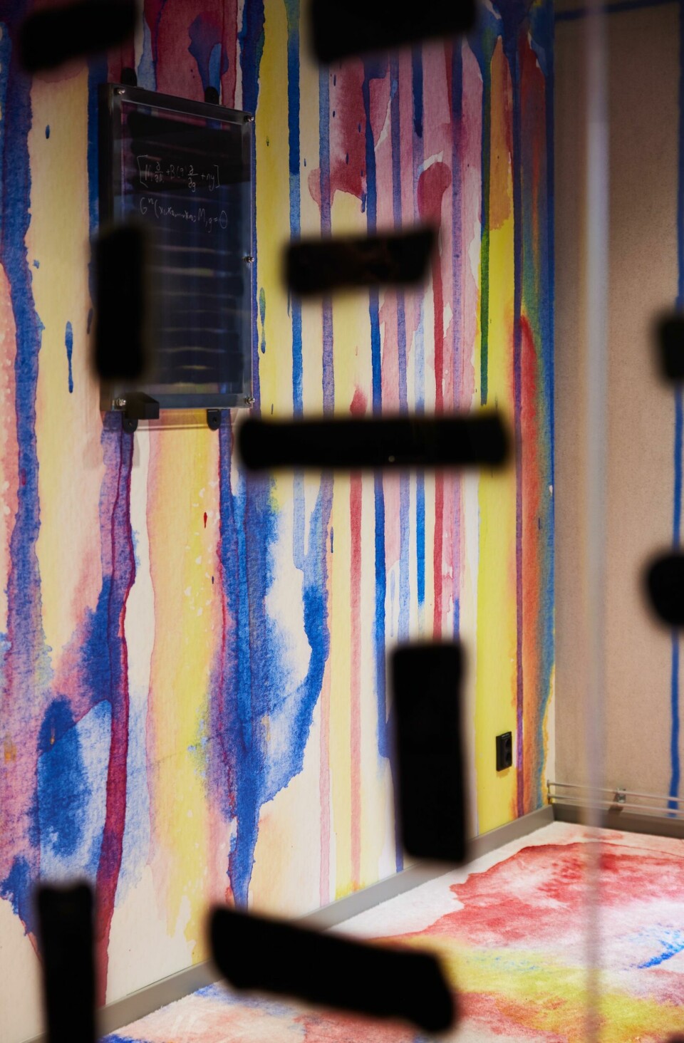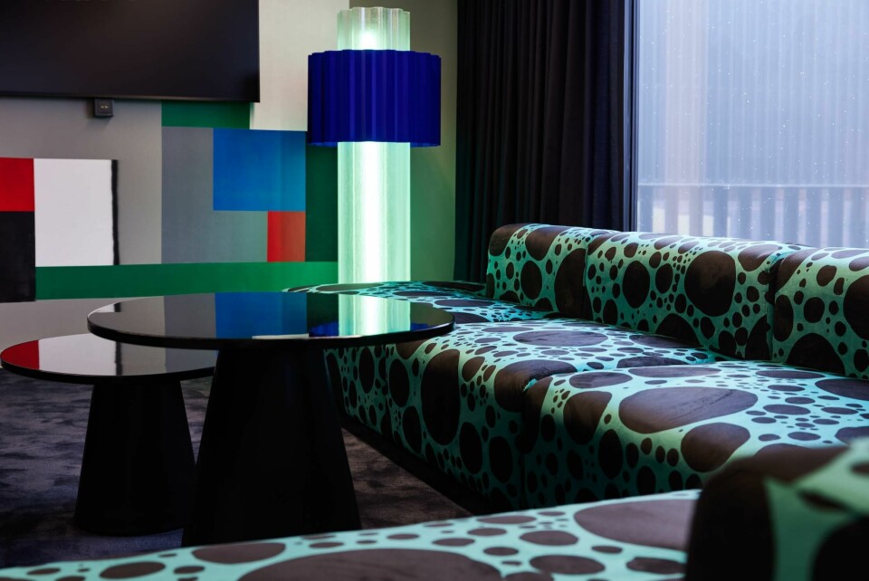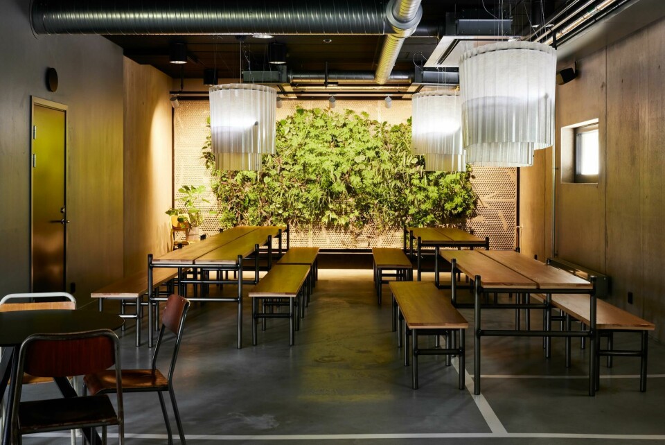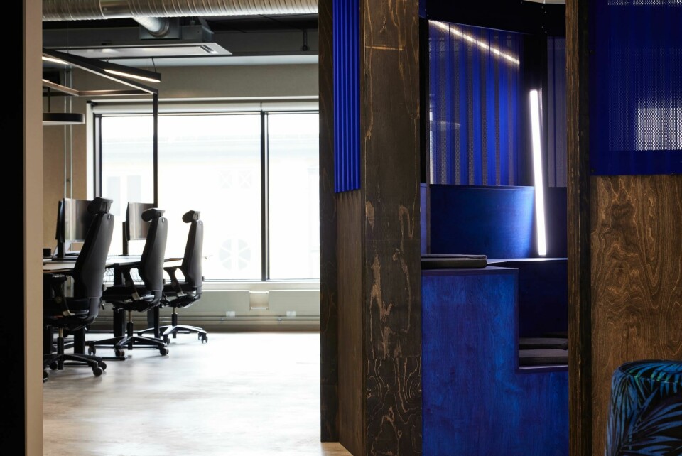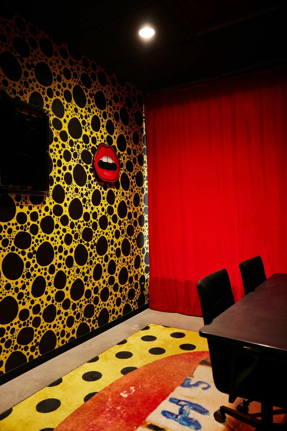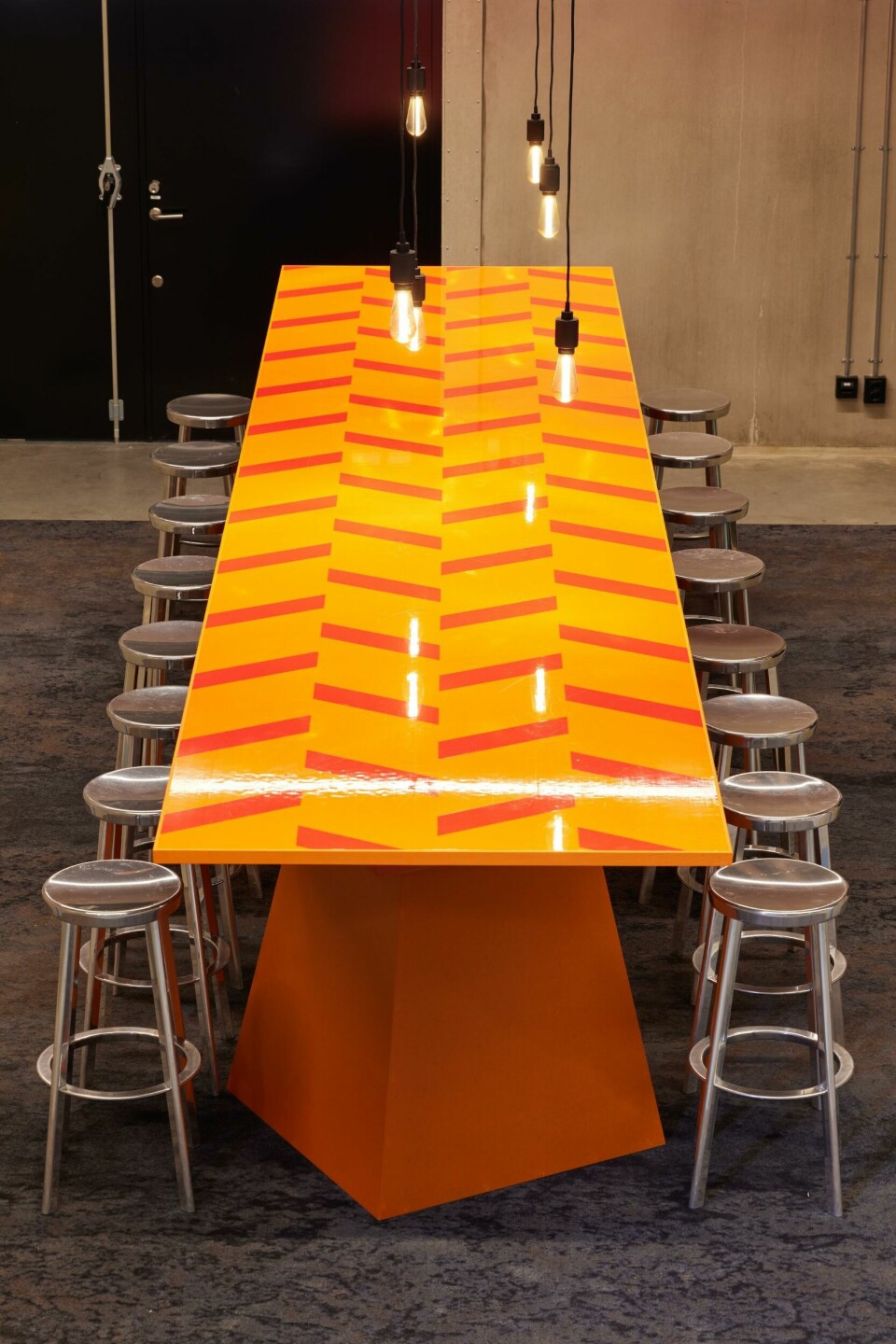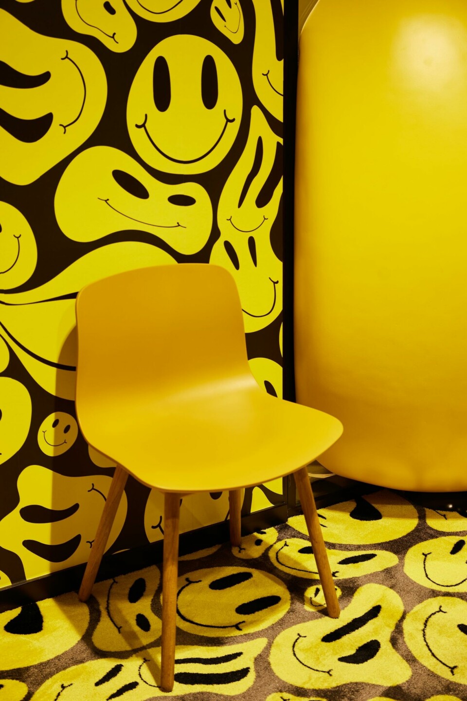The interior design is nothing if not exuberant, channeling a Silicon Valley aesthetic a long way removed from Scandi minimalism. So, we have giant smiley faces, dotted sofas and red meeting room tables. Much of the furniture has been sourced second-hand to keep with a sustainable ethos and give the space a lived-in feel. Similarly, the architects encouraged the tradesmen to leave their measurements on the walls.
