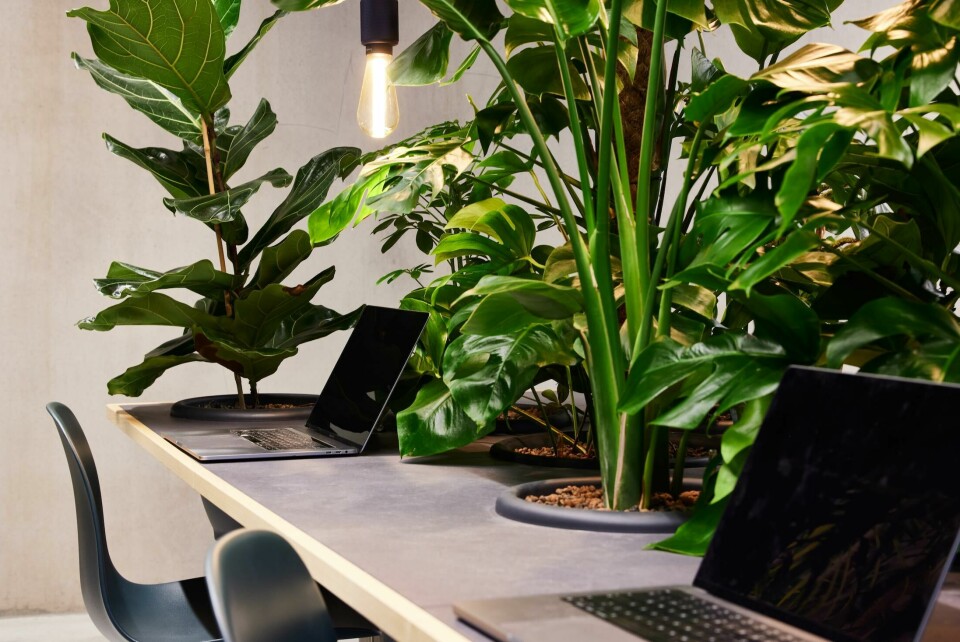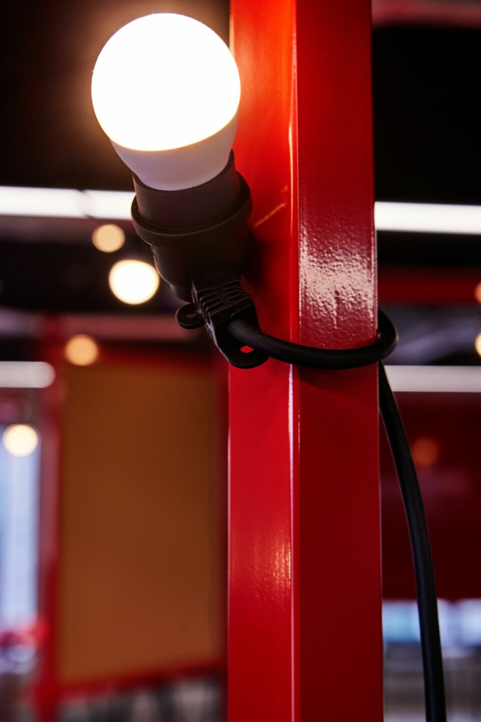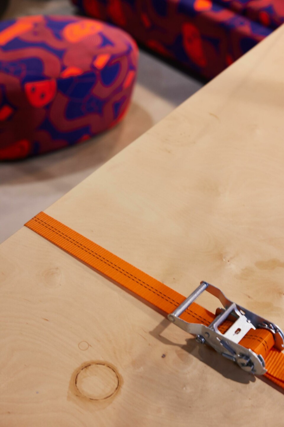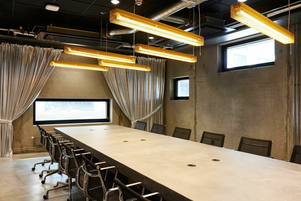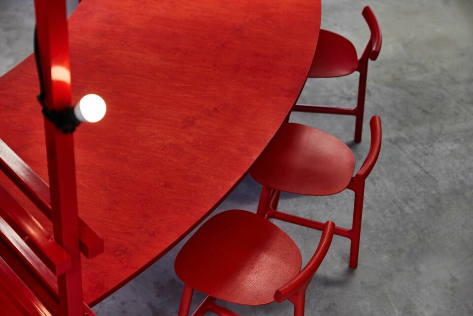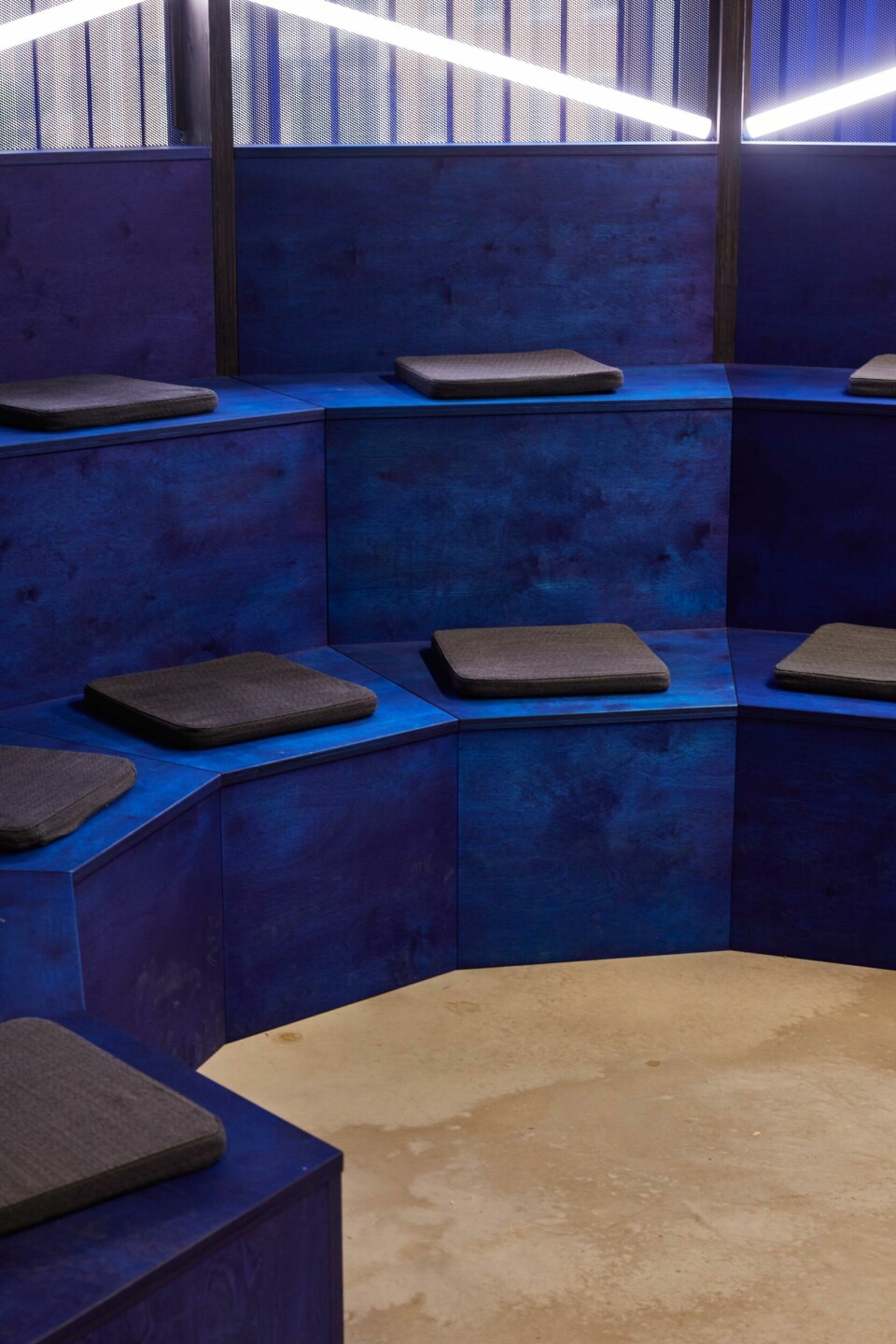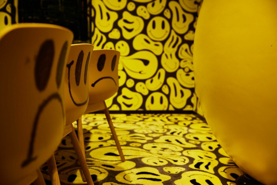 The interior design is nothing if not exuberant, channeling a Silicon Valley aesthetic a long way removed from Scandi minimalism. So, we have giant smiley faces, dotted sofas and red meeting room tables. Much of the furniture has been sourced second-hand to keep with a sustainable ethos and give the space a lived-in feel. Similarly, the architects encouraged the tradesmen to leave their measurements on the walls.