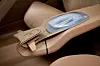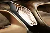 The interface concept uses artificial intelligence: two crystal pieces – one set diagonally between two wood-clad dashboard loops, and the other housed horizontally, within the rear centre armrest – glow, pulse and refract light to confirm understanding of driver or passenger gestures or voice commands. Consequently, hardly any physical switches, knobs or even touchscreens are required.