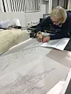 The embroidery was the work of London-based Hand & Lock, who used a quilting technique dating back to the 14th century, known as ‘trapunto’, or ‘stuffed work’, where extra padding is slipped behind the textile top. The raised design reflects the light and provides shadow on the surface, giving a sculptural effect.