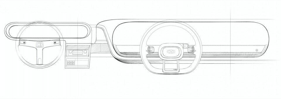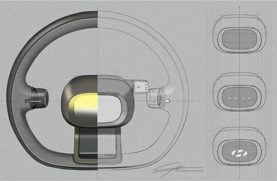 The HCD-4 45 project, which took around nine months in the run-up to the Frankfurt motor show in September 2019, kicked off with a challenge to Hyundai’s global studios. “Both interior and exterior designs were chosen through competitions,” says SangYup Lee. “In the course of the exterior design competition, designs that inherited the style of the past Pony, simply modernised, were excluded.” The sketch shows the Pony’s three-spoke steering wheel for reference.