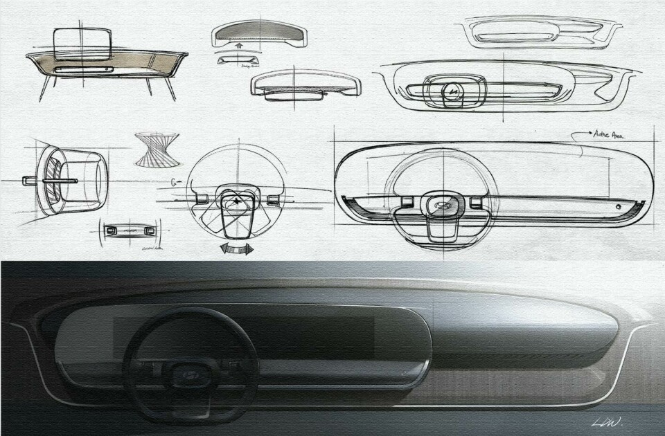 “The starting point of the composition was the most difficult part [of the project]: approaching the concept of living space, breaking away from the conventional concept and inertia of designing the interior of a vehicle, and creating a [unique] space for electric cars,” says lead interior designer Hyeong Soo Lee, explaining that setting up the core design concept took about three months. Ideas explored in the early design phase included a transparent glove box and a stowage concept enabling users to easily identify or hide items without actually opening a storage space.