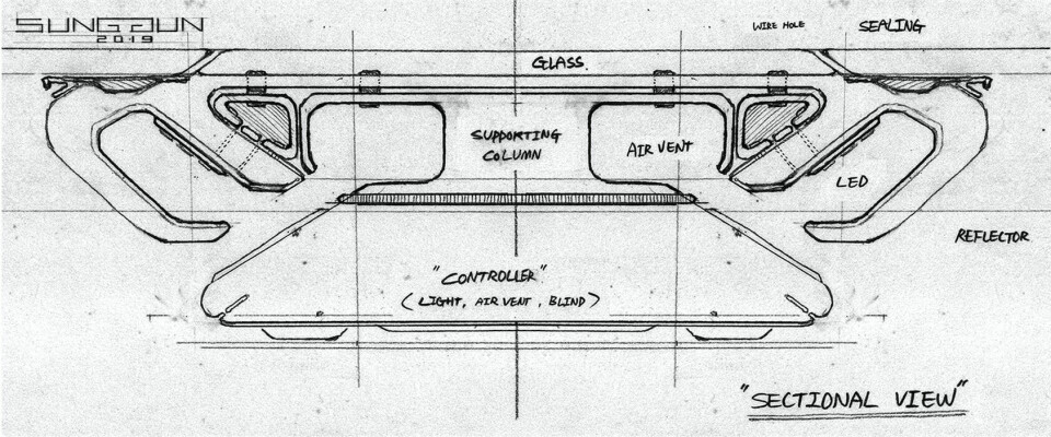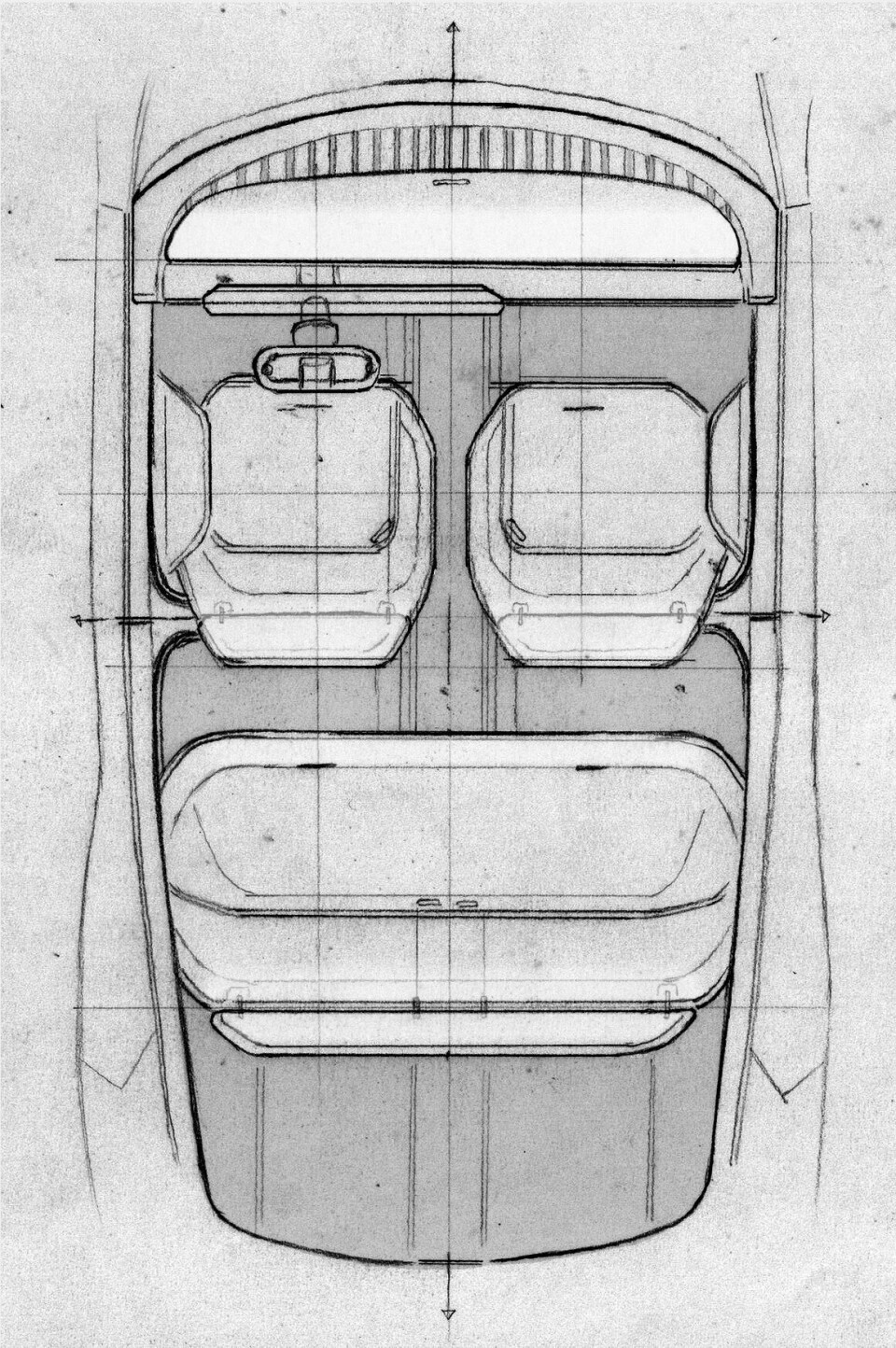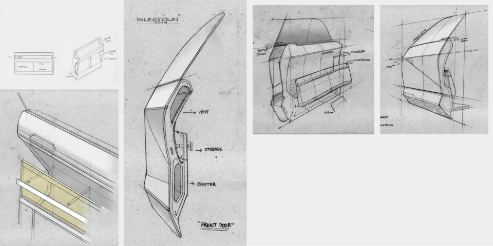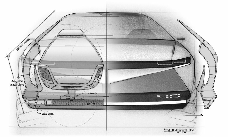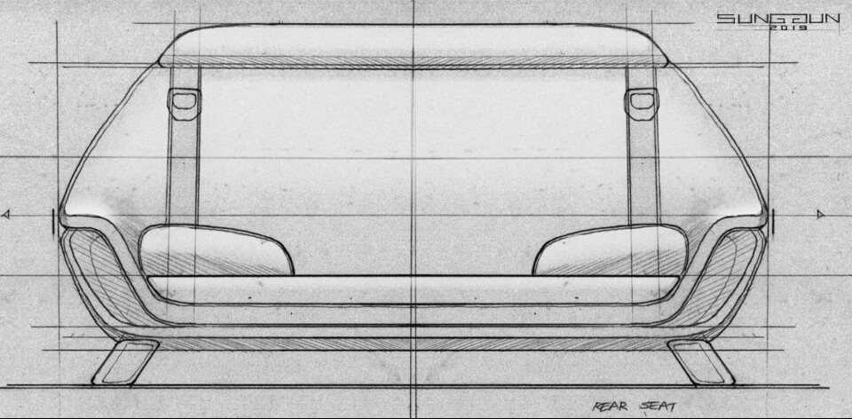 Positioning the front and rear luggage spaces and the mounting of the doors were carefully thought about with reference to access on-street in traffic, Hyeong Soo Lee notes, adding: “We also considered last-mile mobility by installing an electric scooter inside the vehicle. We’ve been thinking deeply about the ideas of caring for the lifestyle of consumers beyond the space [of the car itself].” Accommodating the scooter is indicated in the door section sketch; the ‘sectional view’ sketch [above] shows the roof controller layout. “Detailed sketches continued constantly to the point of completing the model,” says team leader Beom Soo Cho. “In particular, we were able to come up with and embody a variety of ideas that we didn’t get in our [early] sketches, by creating and using study models [to develop] ergonomic convenience.”