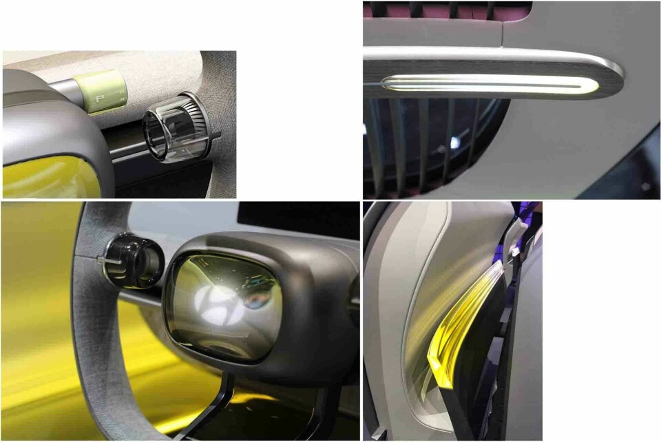 This experience is heightened by the colour, trim and materials. “Wood and the fabrics on the furniture were mostly used to express a comfortable and warm mood such as homeliness, and the lemon yellow highlight colours [as projected by the interior lighting] were placed throughout the ‘room’ to express warm yet high-tech sensibilities,” says Hyeong Soo Lee. “We were able to implement materials that felt like furniture without restriction, because of the hidden ‘shy tech’ technology.” Sustainability and eco-friendliness were also important when picking the wood, leather and textiles, in terms of their weight and surface treatments. In the final show car, the refined storage concept uses transparent materials, so it is easy to see the items packed away; the door-mounted device pockets feature a horizontally-elongated shape to accommodate books or tablets.