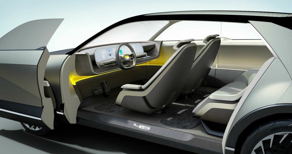 The team looked to achieve a friendly interior ambience. “I thought about the things we consider when choosing furniture,” says SangYup Lee. “The elements required long-term eye contact, harmony, and optimised arrangements for families to communicate comfortably.” A wraparound architecture maximises the sense of space, sweeping around the cockpit, and the armchair-like seats feature integral armrests; there is no large centre console to break up or divide the space across the expansive flat floor enabled by the electric powertrain. The seats rotate for sociability – the 45 theoretically has self-driving capability – as well as swivel towards the sliding side doors for easier access.