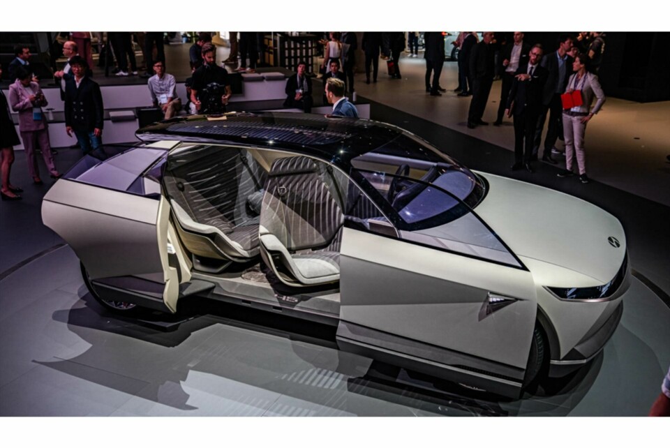 The way natural light is carefully deployed throughout the cabin is a key strategy in creating the overall feeling. “Daytime scenarios were designed with inspiration from blinds inside a house that can effectively control the light intensity, and electronic controls were applied to adjust the angle of each frame so that different light levels could be adjusted in the front and back, completing a design considered for all passengers,” says Beom Soo Cho. “In addition, indirect lighting was applied to area such as the roof and door storage spaces at night to create a comfortable atmosphere, and the brightness and lighting angles were adjusted in detail to minimise eye fatigue, without impeding night visibility.” The exterior lighting is also part of the user experience: active LEDs at the bottom of the doors communicate levels of battery charge, intended to reassure drivers or passengers new to electric vehicles.