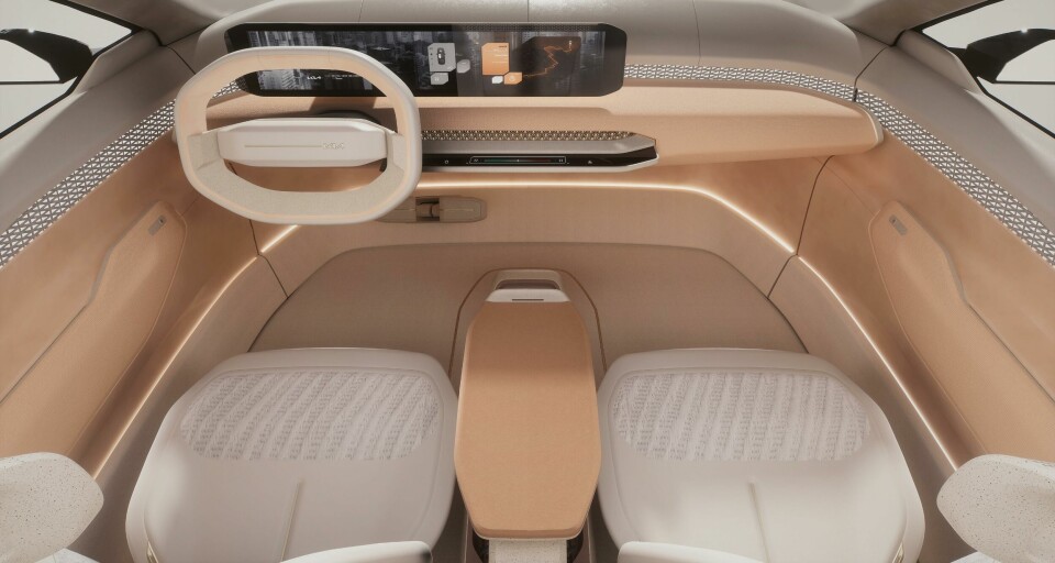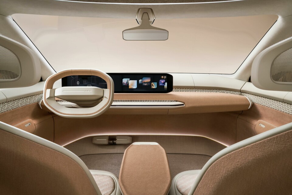 The benefits also extend inside the cabin. The interior appears spacious and uncluttered, decked out in cream-caramel upholstery that plays nicely with the bronze exterior paint. An oblong steering wheel (found on the other concepts but not the production EV5) is in keeping with the wide, stretched out central display and instrument panel. If some interiors can be described as portrait orientation, this is very much a landscape layout.