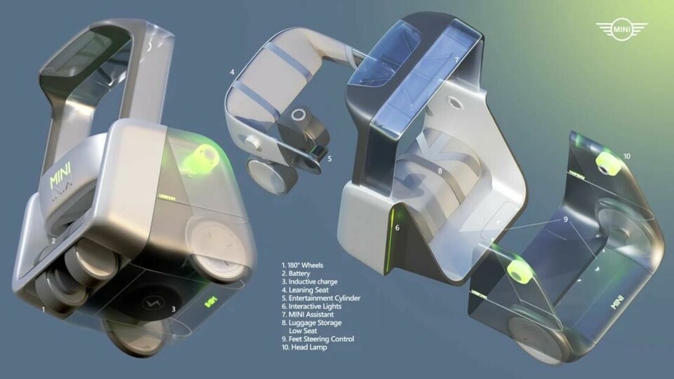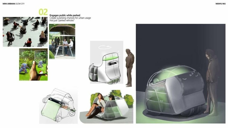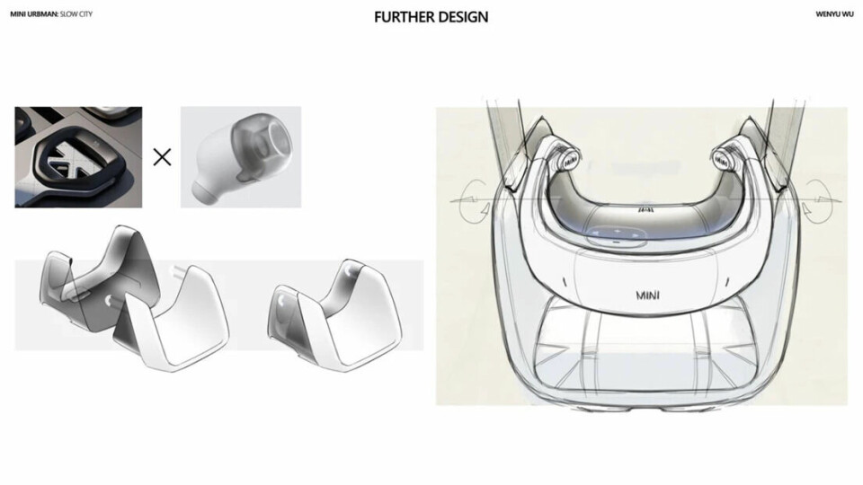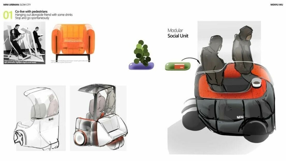 Having worked for a Munich-based design firm, it was only natural for Wenyu Wu to partner with Mini for the Urbman concept (a clear progression of the ‘Paceman’ and ‘Aceman’ naming strategy.) The concept is designed for a “slow city” that takes life a little less seriously and where congested roads are a thing of the past. This micro pod allows the passenger to sit upright and glide around town. When parked, it effectively becomes a park bench until someone else needs a ride. The user interface includes a cute LED face that communicates with pedestrians. The CMF theme is bang on brand and certainly brings new meaning to the word ‘Mini’ in this respect. “This is a completely new type of vehicle,” Wu told Car Design News.