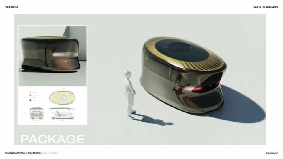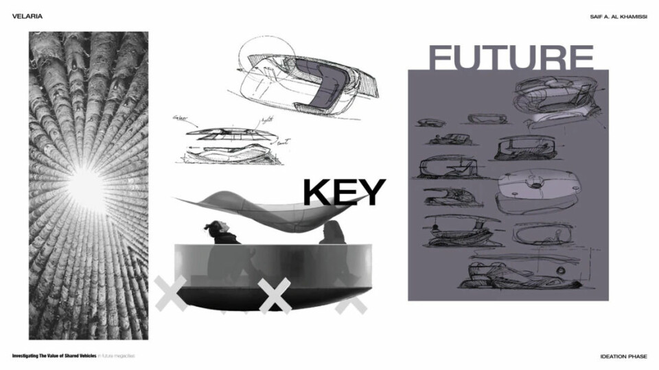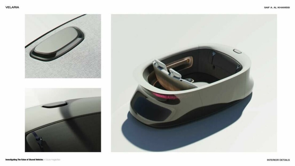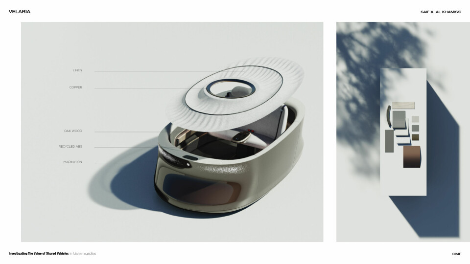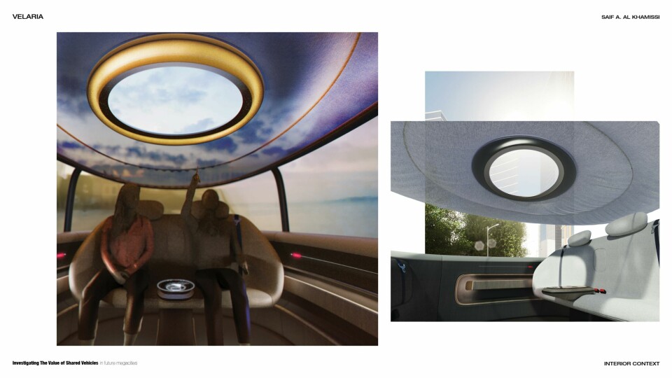 Urbanisation was also on the mind of Saif Al Khamissi, who suggests that shared vehicles can connect people in new ways and re-think social interaction (it is often said that a busy city can feel like the loneliest place in the world, after all.) The centrepiece of his design – called Velaria – is the circular semi-transparent skylight that draws inspiration from the Oculus of the Pantheon in Rome. Khamissi says this creates an ethereal and calming atmosphere that changes the way people communicate. “This skylight in the car celebrates the sky as part of the interior,” he said, “and it reminds us that we are all under the same umbrella in this world.”