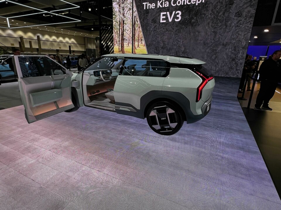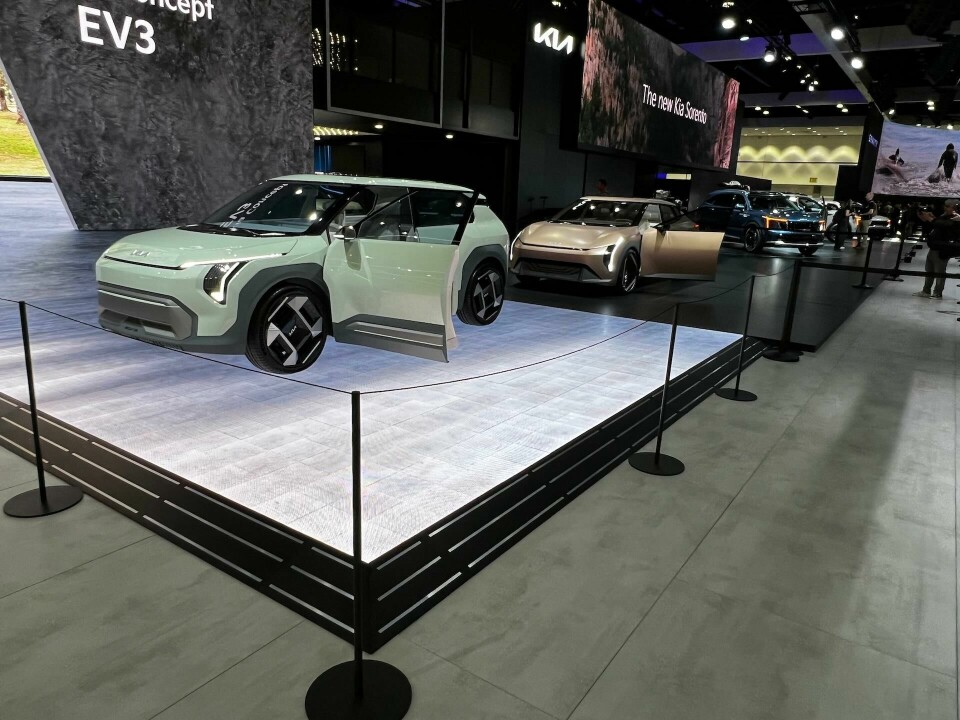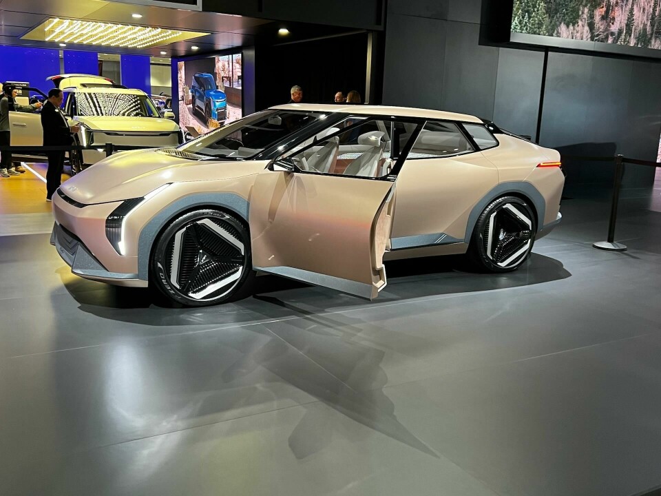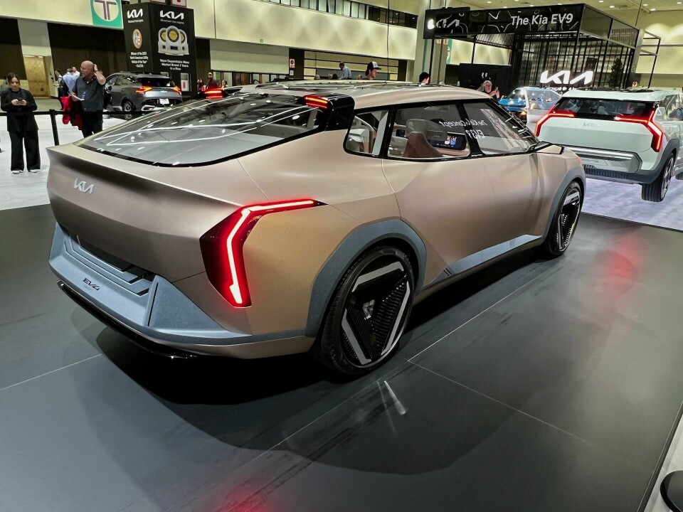 Kia brought two EV concepts to the show, a chunky compact crossover called the EV3 and a sporty angular sedan called the EV4.