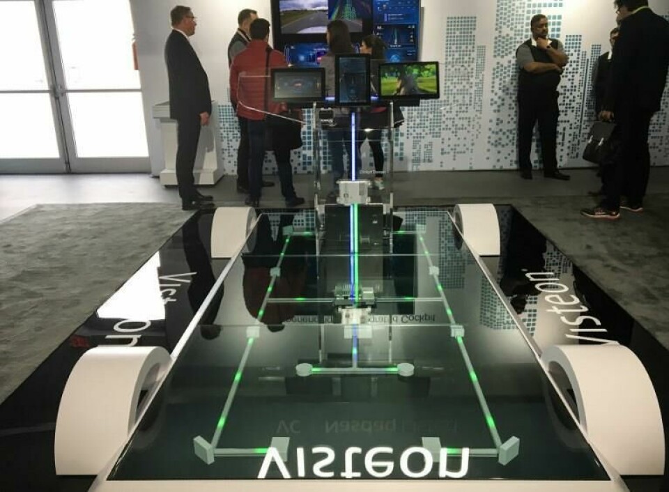 A mock-up of autonomous driving sensors and computers at the Visteon pavilion